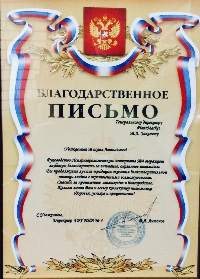 Директор ГБУ ПНИ №4 Антонов Виктор Андреевич направил благодарственное письмо в адрес руководства PlantMarket за внимание оказанное инвалидам, и пожелал всему коллективу питомника здоровья, успехов и процветания.