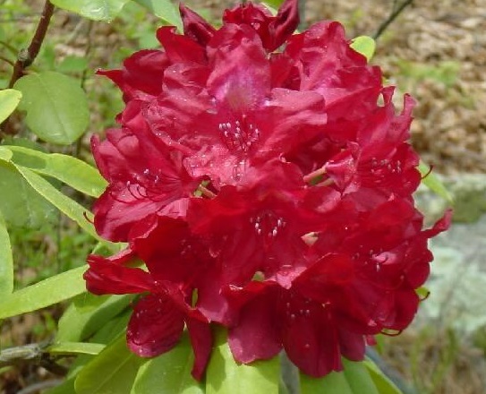 Цветки в бутонах почти черные, затем темно-красные, с ярко выраженными белыми тычинками и более светлым пятном на верхнем лепестке, крупные, собраны по 19-25 штук в эффектные шаровидные верхушечные соцветия. Цветет очень обильно в конце мая-начале июня.Листья кожистые, темно-зеленые, слегка блестящие. Вечнозеленый кустарник со средним сильным ростом и шаровидным характером.