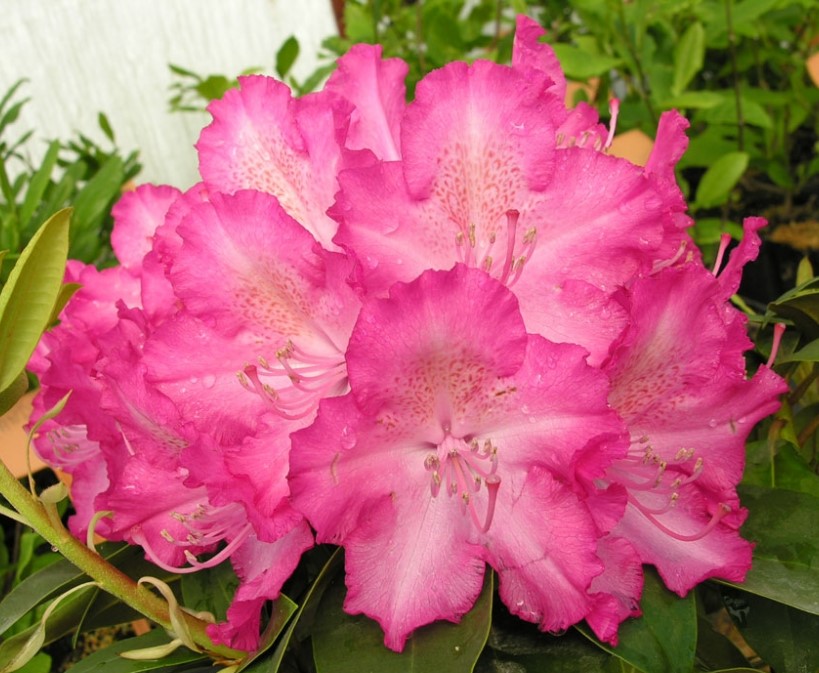 Цветки очень декоративные, двухцветные, в бутонах красные, после развития внутренняя часть цветка розовато-белая с нежным желто-розовым пятном, края кроны красные. Диаметр одиночных цветков от 6,6 до 7,2 см. Цветки собраны по 11-13 штук в широкие, величественные, верхушечные соцветия. Цветет очень обильно в конце мая, вплоть до середины июня. Через 10 лет он вырастает примерно до 1,2 м в высоту и 1,4 м в ширину. Листья зеленые, слегка блестящие, длиной 14 см и шириной 6 см.