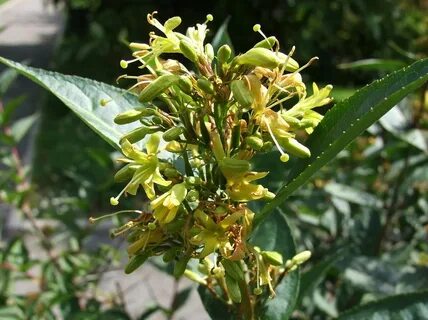 Кустарник до 1.5- 2 м высотой с густой кроной из каскадов ветвей диаметром до 2,5 м. Листья цельные, ярко-зеленые. Весной, при распускании, листья имеют пурпурный оттенок, осенью приобретают красноватые или пурпурные тона. Цветки трубчатые, лимонно-желтые в полузонтиках, собранных в конечные метелки, расположенные в пазухах верхних листьев.