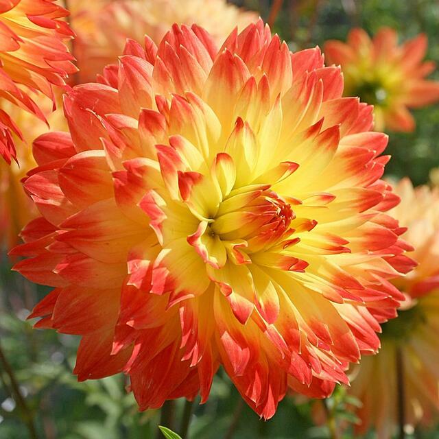 Яркий и праздничный желто-оранжевый сорт с соцветиями, похожими на огненные шары диаметром около 15 см. Отличается длительным цветением, формирует сильные плотные кусты высотой более 1 метра, великолепно смотрится в срезке, в миксбордере и в одиночной посадке. В грунте не зимует, но легко переносит зимнее хранение в прохладном помещении в ящиках с песком.
