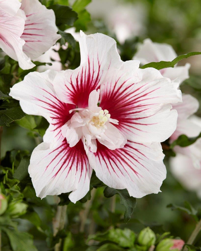 Гибискус сирийский Старберст Шифон стал очередным удачливым представителем небольшой серии культурных гибискусов. В 2017 году он получил бронзовую медаль на выставке «Плантариум», откуда и начал свое путешествие по миру. Особенностью сорта является его способность адаптироваться к совершенно разным условиям произрастания, демонстрируя идентично пышное сортовое цветение. С первых чисел июля и до начала осени гибискус Starburst Chiffon сохраняет идеальные абрисы своего густого куста и не дает яркой зеленой листве поникнуть под натиском солнечных лучей. Он знает, что без листьев его уникальные цветки не произведут необходимого ошеломляющего эффекта. Белоснежные гофрированные лепестки густо расчерчены ярко-малиновыми штрихами, сгущающимися у основания. Их насыщенность оттеняет милый «букетик» коротких белых лепестков, расположившийся в самом центре соцветий.