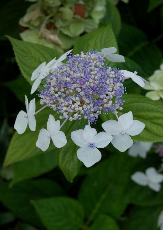 Гортензия Ланарт Уайт – декоративный многолетник с цветами, собранными в соцветия необычной формы. Этот кустарник обращает на себя внимание особым изяществом, продолжительным цветением и выносливостью. Крупные соцветия состоят из стерильных и фертильных цветков. Крупные стерильные цветки – белые, с заостренными кончиками лепестков. Мелкие цветки, расположенные по центру, окрашены в голубой или розово-сиреневый оттенок (в зависимости от кислотности почвы). Высота взрослого растения – 1,2-1,5 м, диаметр куста – до 1,5 м. Период цветения – июль-сентябрь. Диаметр соцветий – до 30 см. Крупнолистная гортензия используется в ландшафтном дизайне парков, садов, дачных и приусадебных участков. Она красиво смотрится в одиночных, групповых посадках и в композициях с другими многолетниками.