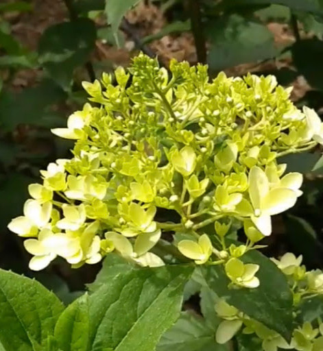 Гортензия карликовая, собрана в пирамидальные соцветия-метелки, при распускании становится зеленоватой, постепенно белеет,затемрозовеет.