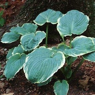 Большие сине-зелене округлые листья с желтым краем, который со временем становится кремовым. Цветы почти белые. Сорт отличается изящной формой листьев, каемка в течение сезона меняет цвет.