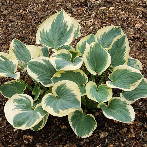 Листва сморщенная в форме сердца, достаточно крупная с голубым отливом. На цветоносах почти не бывает листьев. Цветы лавандового оттенка.