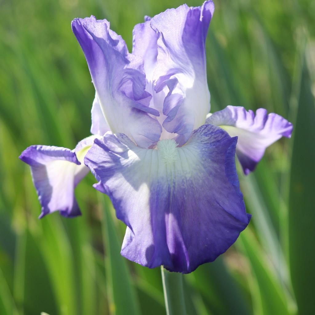 Эффектный однотонный голубовато-фиолетовый с почти белым центром и контрастной лимонно-желтой бородкой; цветки очень крупные - на одном цветоносе может быть до 4х одновременно открытых бутонов. Легкое гофре. Повторное цветение. Срок цветения средний. Имеет награды.