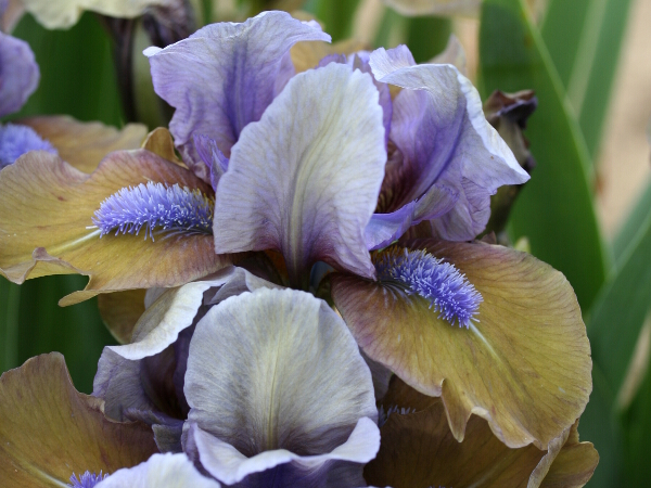 Очень эффектный цветок, благодаря своему необыкновенному окрасу, сочетающему медно-сине-фисташковые оттенки. Особенно игриво смотрится насыщенно лавандовая бородка на нижних медных лепестках. Стандарты лавандовые, фолы зеленовато-коричневые. Бородка фиолетовая. Имеет награды.