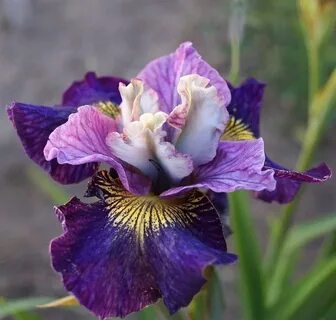 Стандарты бледно-голубые с красно-фиолетовыми пятнами и прожилками. Стайлы при открытии сильно завитые, с красно-фиолетовыми полосками, бледнеющими затем до перламутрово-голубых. Фолы широкие, перекрывающиеся, сине-фиолетовые в центре и красно-фиолетовые ближе к краям, в различной степени пятнистые, испещрённые прожилками. Сигнал золотисто-жёлтый с пурпурными прожилками. Аромат лёгкий, сладкий.