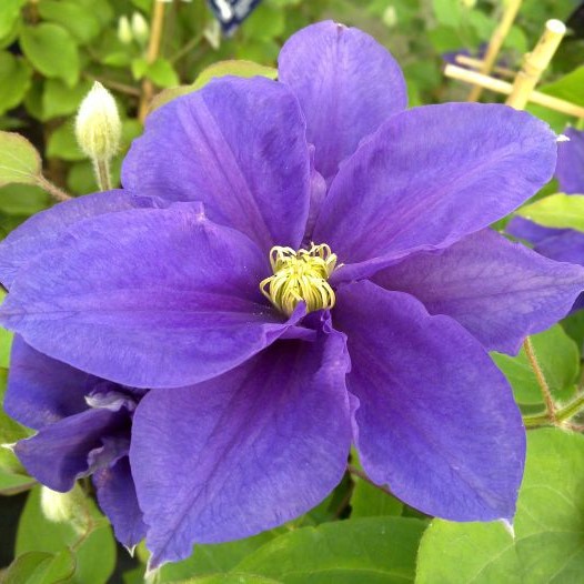Клематис с фиолетовыми цветками и жёлтыми тычинками, сорт подходит для выращивания в контейнерах
