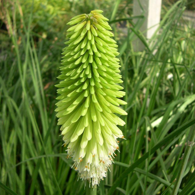 Цветение книфофии это феерическое зрелище. Из центра листовой розетки появляются колосовидные соцветия, расположены на длинном безлистном цветоносе. Бутоны будущих цветков зеленоватых оттенков. Распускаются они постепенно сверху вниз, или снизу вверх. Открывшиеся бутоны напоминают маленьких колокольчиков, и по мере распускания их окраска меняется. Когда все цветки раскрыты, соцветие напоминает длинную шишку, бело-зеленого цвета.