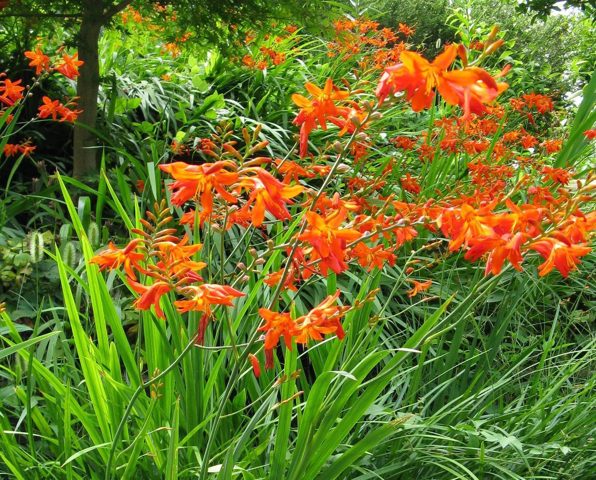 Восхитительный новый сорт - это фруктовая смесь яркого оранжевого с розовым. Крокосмия Окаванго- растение до 90 см высотой. Стебель прямой, тонкий. Листья мечевидые, светло-зеленые, в густых пучках. Цветки диаметром 3-5 см, воронкообразные, оранжевые, собраны в соцветие. Цветет в июле-августе, одновременно до 10 цветков. Клубнелуковицы похожи на клубнелуковицы гладиолусов, репчатой формы, до 2,5 см в диаметре. Растение чудесно выглядит на солнечных клумбах из-за длительного и обильного цветения.