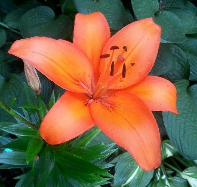 Лилии сорта Amiga вырастают до 110 см в высоту, имеют крупные темно-зеленые листья и цветки диаметром до 20 см ярко-оранжевого цвета, сильный сладкий аромат