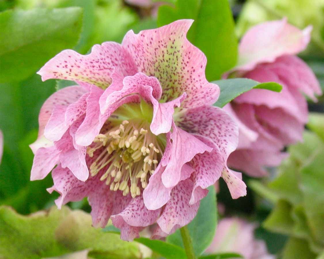 Сортосерия «Double Ellen». Смесь. Цветки махровые, могут быть белого, розового или пурпурного цвета. Цветение обильное, в апреле. Листва кожистая глянцевая.