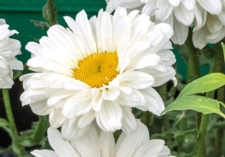 Цветки крупные, внешне напоминают классическую ромашку, с которой этот сорт часто путают. Сердцевина желтая. Лепестки белоснежные, одинаковые, растут в 2 ряда. Прекрасный универсальный сорт для садов любого стиля.