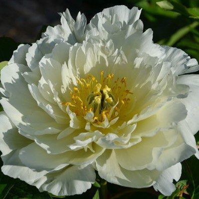 Пион с крупными цветами белого цвета. Лепестки резные, у основания кольцо заметных кремовых тычинок. Цветы полумахровые, куст компактный, с прочными стеблями.