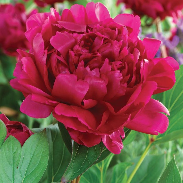 Пион махровый, полушаровидный, лепестки сложены в соцветия карминно-красного цвета с фиолетовым оттенком. Сильно ароматный.