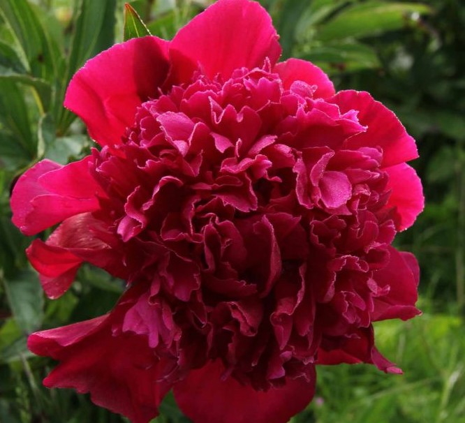 Пион с махровые, шаровидной формы цветками. Окраска – малиново-красная с белыми штрихами на краях. Внутренние лепестки узкие и плотно прилегают к внешним, образуя шар.