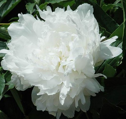 Пион в роспуске нежно-розового цвета, затем становится белым. Цветок пушистый, кружевной, состоит из очень узких и очень широких лепестков неправильной формы. Листва светло-зелёная.