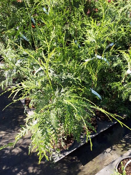 Вечнозелёное колонновидное дерево с густо-расположенными и строго вертикальными побегами и ветвями, конусовидная форма сохраняется. Хвоя темно-зелёная, блестящая, чешуйчатая, расположенная супротивно.